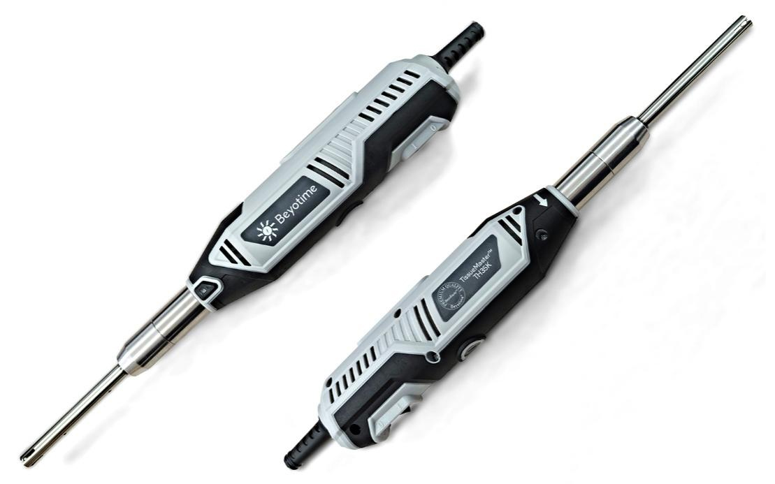 碧云天的TissueMaster™ TH35K手持式高速匀浆机(35000rpm),即TissueMaster™ TH35K Handheld High Speed Tissue Homogenizer,简称TH35K,也称手持均质仪、手持匀浆机、手持匀浆仪、手持式分散机、手持式均质分散机、手持调速式组织匀浆机、手持组织匀浆机、手持插电式匀浆机、可调速匀浆机、变速匀浆机、高速均质机、高速匀浆机、便携式匀浆机、小型匀浆仪、小型组织匀浆器、小型便携式匀浆机、迷你电动匀浆仪、手持式电动组织匀浆器、手持可调速组织匀浆仪、便携式电动组织匀浆器、动植物组织匀浆仪、Handheld Homogenizer、Portable Homogenizer、Handheld Disperser、Handheld Homogenizing Disperser、Handheld Tissue Homogenizer、Handheld Variable-Speed Tissue Homogenizer、Motorized Homogenizer、Handheld Plug-in Homogenizer、Variable-Speed Homogenizer、High-Speed Homogenizer等。本TH35K手持式高速匀浆机是一种依靠高速电机驱动分散刀头产生强大的液力剪切效应,将样品循环吸入高速相对运动的定转子间的狭小空间,进行高速剪切与分散,再通过定子喷出,达到均质与匀浆的仪器,是一款经久耐用、稳固可靠、操作简单、灵巧便携,实验室常用的小型高速匀浆机。本产品适用于液体之间的混合、乳化与均质,液体与固体粉末的分散均质,组织细胞的捣碎、浆化,以及油水乳化、纳米材料分散、乳品均质、聚合反应、日用化妆品、油墨涂料、精细化工、农药等,常用于Western、生化检测及DNA/RNA等样品的提取和检测。本TH35K手持式高速匀浆机为碧云天BeyoEquip™高品质仪器系列产品之一。