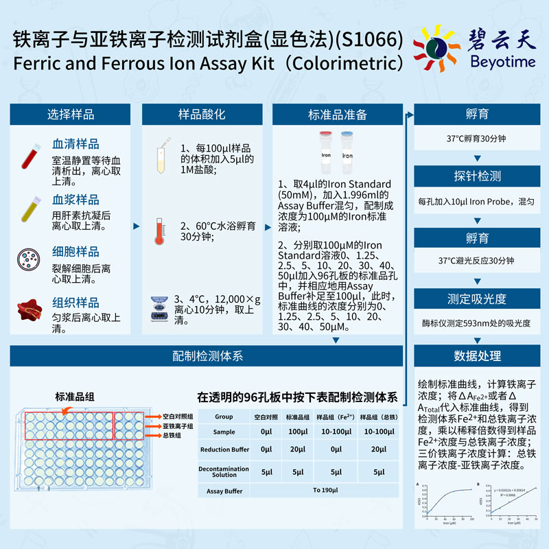 碧云天的铁离子与亚铁离子检测试剂盒(显色法) (Ferric and Ferrous Ion Assay Kit, Colorimetric),又称Ferrous Ion Assay Kit、Iron Ion Assay Kit、Iron Test Kit、铁离子含量检测试剂盒、总铁离子检测试剂盒或铁离子检测试剂盒,是一种利用吸光度检测方法,快速、高灵敏地对血清、血浆、组织、细胞以及组织裂解液样品中总铁离子、三价铁离子(高铁)或二价铁(亚铁)离子含量进行高灵敏度检测的试剂盒。
