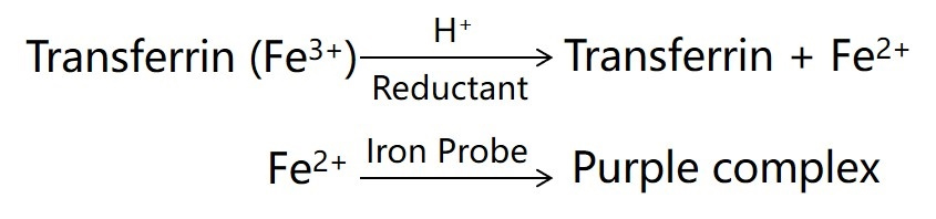 本试剂盒的检测原理请参考图1。在酸性条件下,铁从复合物中(如Transferrin)解离出来,然后使用还原剂(Reduction Buffer)将三价铁离子还原为亚铁离子。Iron Probe与亚铁离子形成紫色络合物,通过酶标仪检测593nm处吸光度,再使用本试剂盒提供的Iron Standard,通过设置标准曲线计算出样品中总铁含量。如需检测样品中亚铁离子含量,则直接加入Iron Probe,而无须加入Reduction Buffer,通过酶标仪检测593nm处的吸光度,再通过标准曲线计算就可获得样品中亚铁离子含量。最后通过总铁离子与亚铁离子含量的差值就能间接计算出三价铁离子含量。