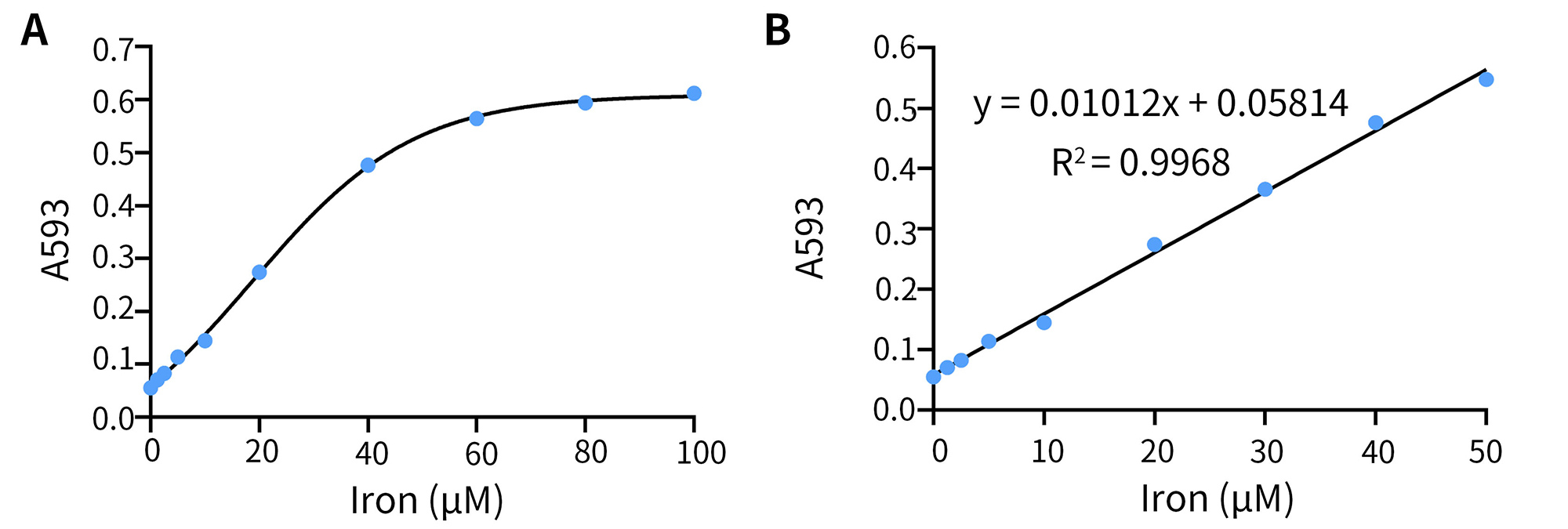 图2.碧云天铁离子与亚铁离子检测试剂盒(显色法) (S1066)用于标准品检测的效果。取100µl用Assay Buffer稀释的各浓度的Iron Standard与20µl的Reduction Buffer混匀后,加入5µl Decontamination Solution,并用Assay Buffer补齐至190µl,37ºC避光反应30分钟。再加入10µl Iron Probe混匀,37ºC避光反应30分钟,然后进行吸光度检测。图A为0-100µM的标准曲线,图B为0-50µM的标准曲线,在0.8-50µM (约0.044-2.8mg/L)浓度范围内有良好的线性关系。实际检测数据会因实验条件、检测仪器等的不同而存在差异,图中数据仅供参考。
