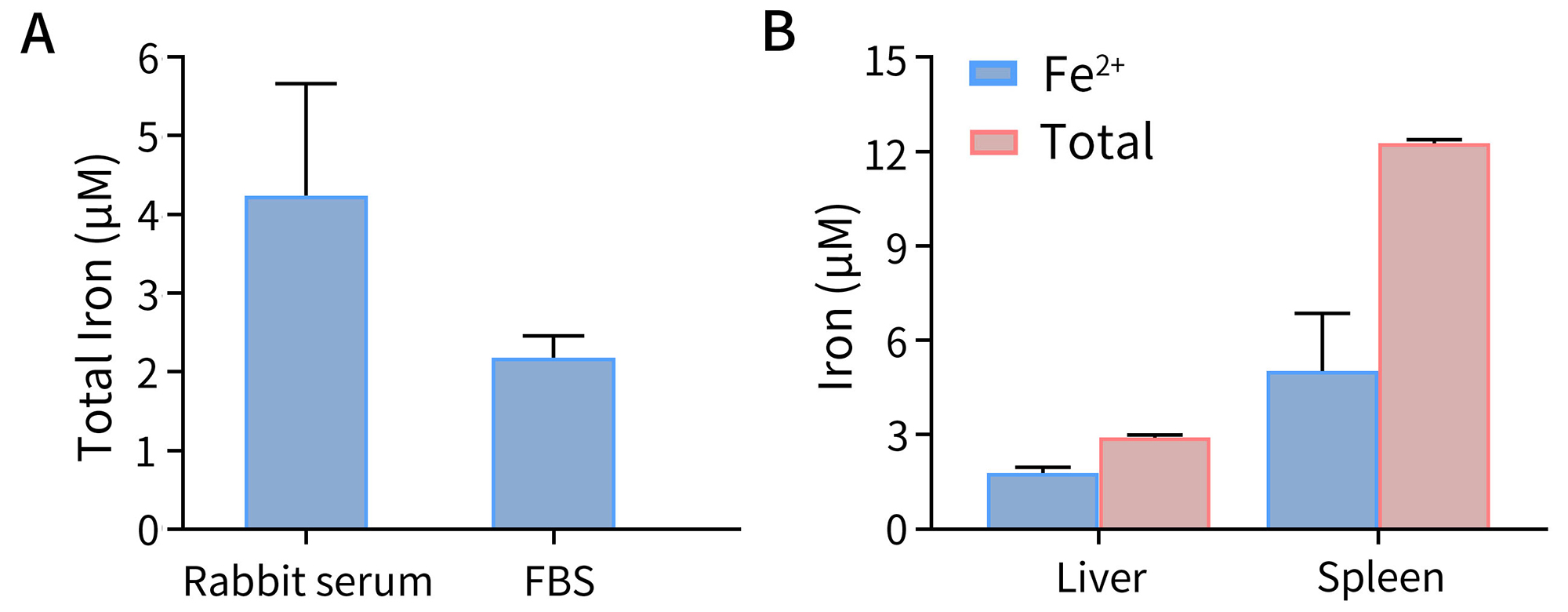 图3.碧云天铁离子与亚铁离子检测试剂盒(显色法) (S1066)用于不同血液或组织样品中铁离子浓度的检测效果图。图A为兔血清(Rabbit serum)、胎牛血清(Fetal bovine serum, FBS)总铁离子浓度检测,图B为小鼠肝脏(Liver)和脾脏(Spleen)样品中总铁离子及亚铁离子浓度的检测效果图。对于总铁离子的检测,取50µl样品和20µl的Reduction Buffer混匀后,加入5µl Decontamination Solution,并加入Assay Buffer补齐至190µl,37ºC避光反应30分钟,直至样品孔中液体清澈透亮。再加入10µl Iron Probe混匀,37ºC避光反应30分钟,随后进行吸光度检测可获得总铁OD值,根据标准曲线计算出样品总铁浓度。对于亚铁检测则上述步骤无需加入Reduction Buffer。如需获得样品中三价铁含量,使用总铁离子与亚铁离子浓度的差值就能间接计算出三价铁离子浓度。实际检测数据会因实验条件、检测仪器等的不同而存在差异,图中数据仅供参考。