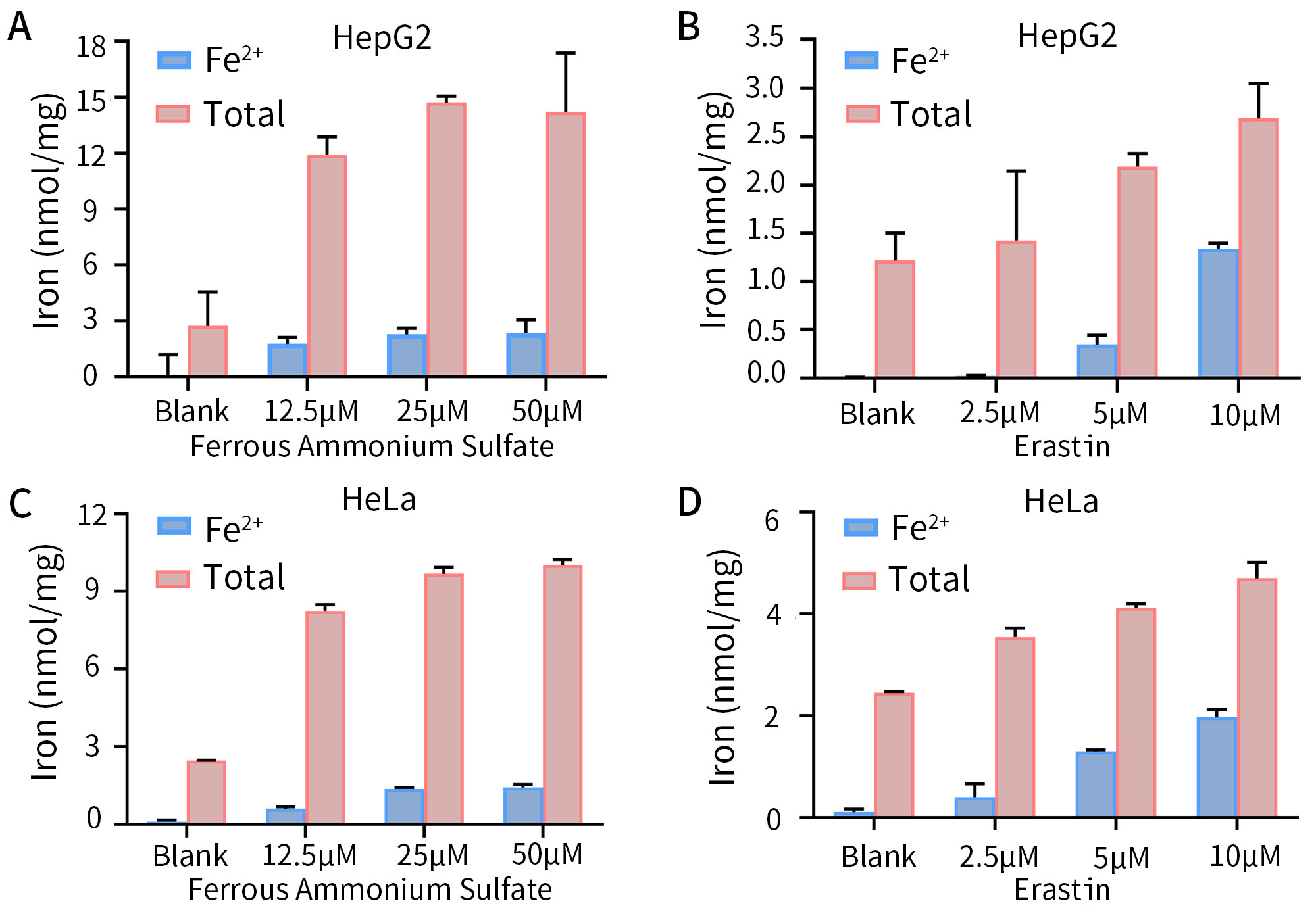 图4.碧云天铁离子与亚铁离子检测试剂盒(显色法) (S1066)用于不同细胞样品中铁离子浓度的检测效果图。图A和图C分别为HepG2和HeLa细胞培养液中添加不同浓度硫酸亚铁铵(Ferrous Ammonium Sulfate)培养24小时后,细胞内铁离子浓度的检测;图B和图D分别为HepG2和HeLa细胞培养液中添加不同浓度的Erastin (Ferroptosis诱导剂) (SC0224),诱导培养48小时后,细胞内铁离子浓度的检测。总铁离子和亚铁检测方法同图3,细胞样品为100µl细胞裂解液(约100万个细胞)使用本试剂盒进行检测。图中的浓度为nmol铁离子/毫克蛋白。实际检测数据会因实验条件、检测仪器等的不同而存在差异,图中数据仅供参考。